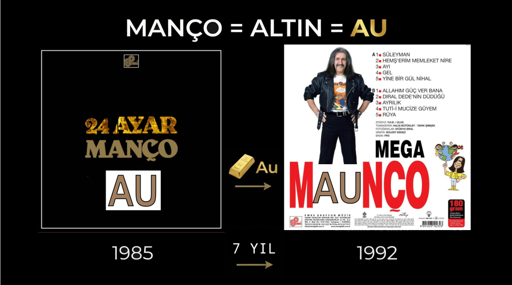 • Barış Manço’nun 1985 yılında yayımlanan 24 Ayar albümünün kapağında “24 Ayar Manço” yazısı bulunmaktadır. 24 ayar altın, en saf ve en değerli halini ifade eder. Bu durumda 24 Ayar Manço, “24 Ayar Altın” anlamına gelir. Altının kimyasal sembolü AU’dur.