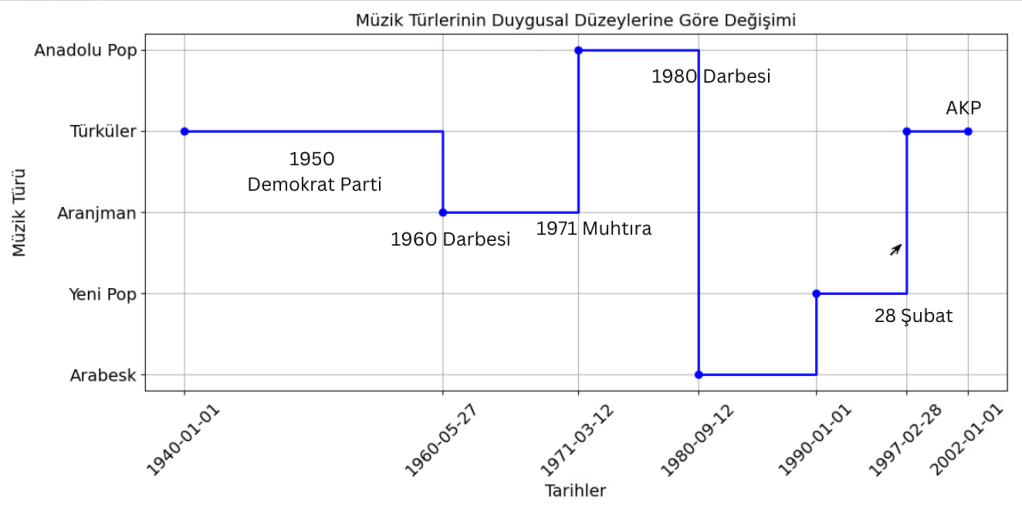 Müzik türlerinin duygusal düzeyleri, aslında kontrol sisteminde sisteme uygulanan kontrol işaretleri gibidir. Topluma farklı düzeylerde duygusal kontrol işaretleri uygulanmıştır ve toplum bu müziklerle istenen duygusal düzeye ulaştırılmıştır. Bu sayede, siyaset ve toplum mühendislerinin yani üst aklın istediği toplumsal olaylara ortam sağlanmıştır. Özellikle 1980 darbesinden sonra, arabeskle birlikte gelen duygusal seviye düşüşü çok tuhaftır; toplum en yüksek düzeydeki pozitif müzikten en düşük düzeydeki negatif müziğe maruz bırakılmıştır. Bu da toplumu duygusal yıkıma götürmüştür.